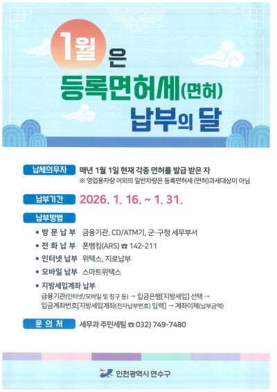 연수구 관계자는 “지방세는 지역 발전을 위한 소중한 재원으로 사용된다.”라며 “기한 내 납부해 주시길 당부한다.”라고 말했다.