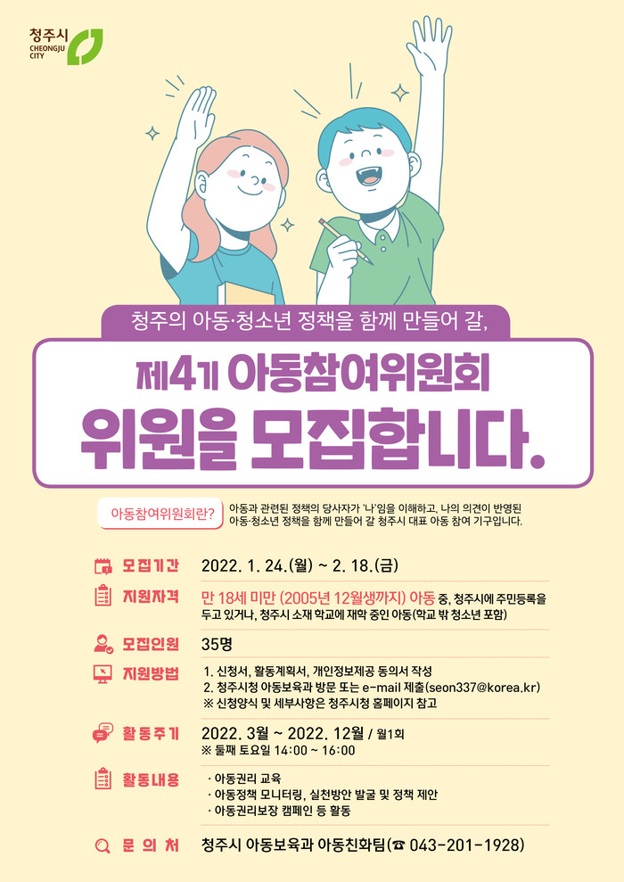 청주시는 아동.청소년 정책을 함께 만들어 갈 제4기 아동참여위원회 위원 35명을 오는 2월 18일까지 모집한다.