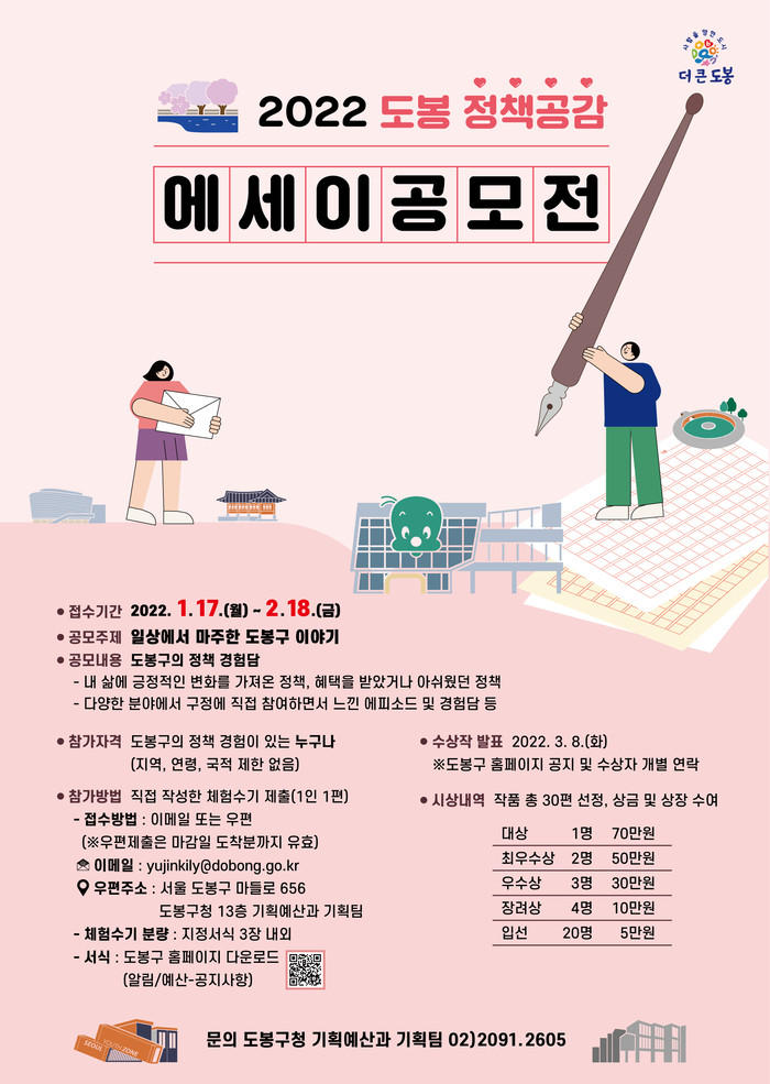 [시민일보 = 여영준 기자] 서울 도봉구(구청장 이동진)는 주민의 관점에서 가치있는 정책을 찾고, 정책 경험담을 기록·공유하기 위한 ‘도봉 정책공감 에세이 공모전’을 개최한다고 19일 밝혔다.