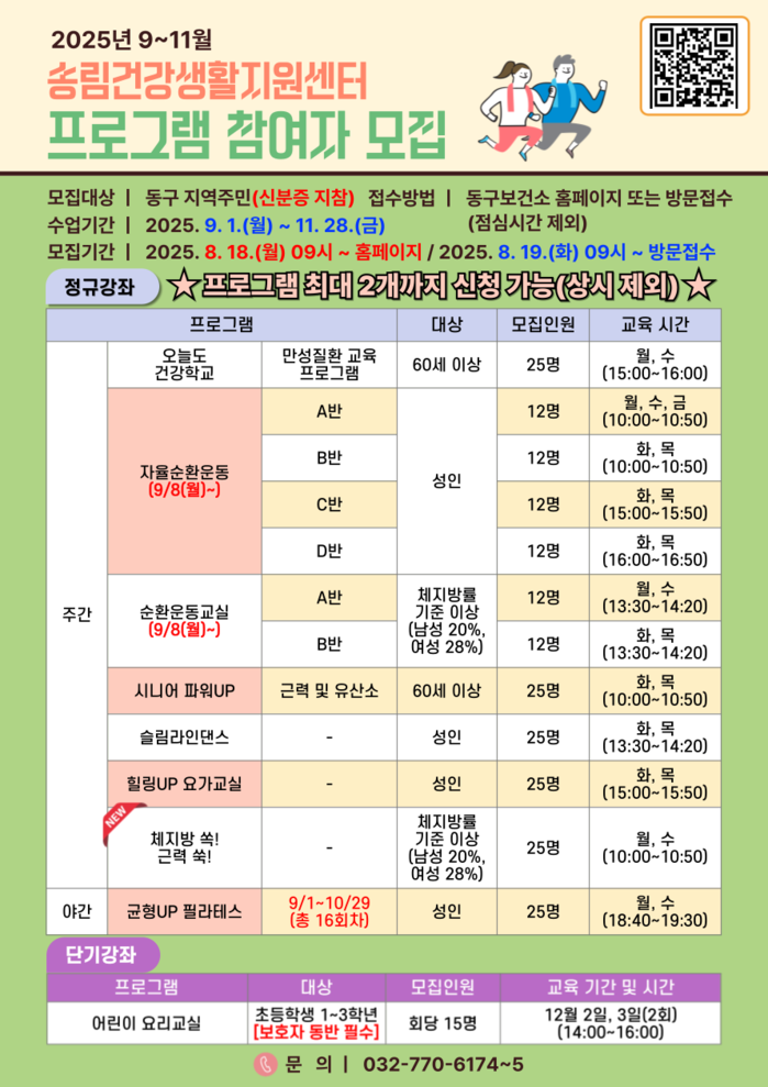 인천=문찬식 기자] 인천 동구(구청장 김찬진) 송림건강생활지원센터는 지역 주민의 건강 증진과 생활 습관 개선을 위한 프로그램 참여자를 모집하고 있다고 밝혔다.