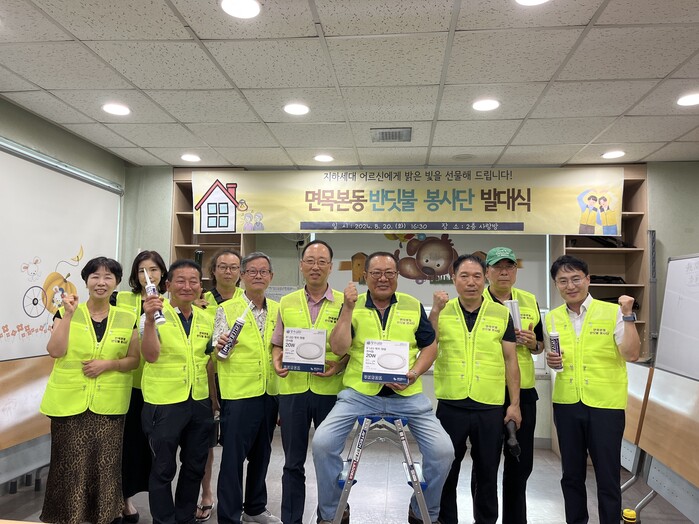 중랑구 면목본동 주민센터가 20일, ‘면목본동 반딧불 봉사단’ 발대식을 개최하며 봉사단의 본격적인 활동을 알렸다. 사진은 발대식에 참석한 관계자들이 기념촬영을 하고 있는 모습. (사진=중랑구청 제공)