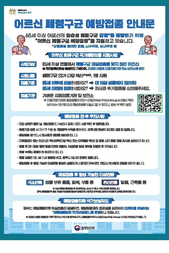 전성수 구청장은 “최근 호흡기 감염병 위험이 커지고 있어 어르신들의 폐렴구균 예방접종이 더욱 중요해지고 있다”며 “많은 어르신들이 무료 접종을 받으시고 안전하고 건강한 노후를 보내시길 바란다”고 말했다.