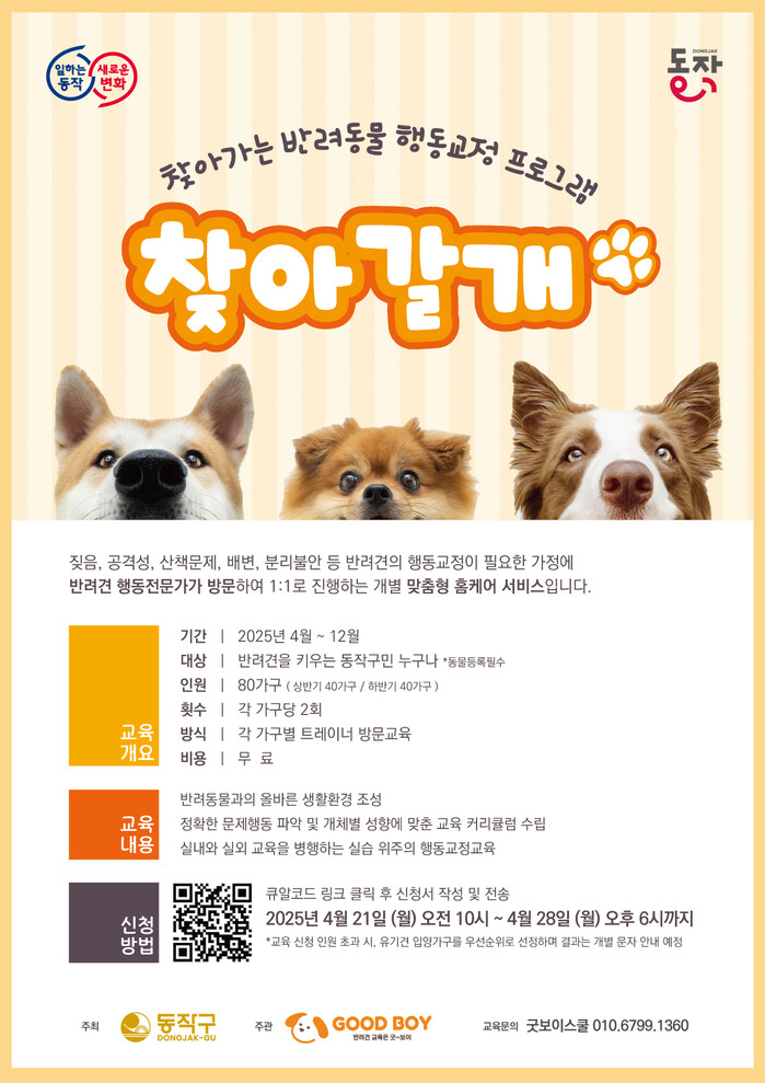 [시민일보 = 여영준 기자] 동작구(구청장 박일하)는 반려견과의 공존을 위한 성숙한 사회문화 조성을 도모하고자 ‘찾아가는 반려동물 행동교정 프로그램’을 운영한다고 24일 밝혔다.