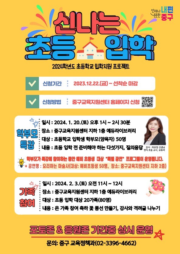[시민일보 = 여영준 기자] 서울 중구(구청장 김길성)가 초등학교 입학 학부모의 걱정을 덜어주기 위해 풍성한 프로그램을 마련한다.