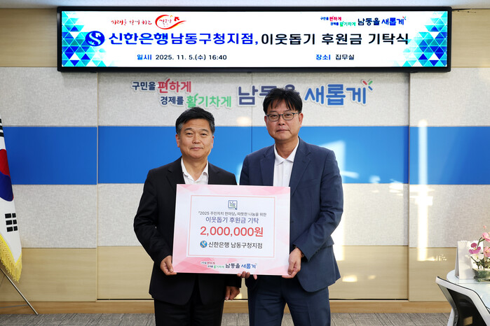 [인천=문찬식 기자] 인천 남동구는 최근 신한은행 남동구청지점이 ‘2025 주민자치 한마당 이웃돕기 후원금’ 200만 원을 기탁했다고 밝혔다.