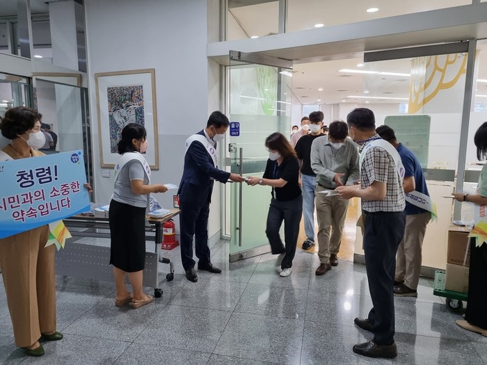 [광주=정찬남 기자] 광주광역시는 18일 점심 구내식당을 이용하는 직원들을 대상으로 ‘공직자의 이해충돌방지법’(이하 ‘이해충돌방지법’) 홍보를 위한 청렴캠페인을 전개했다.