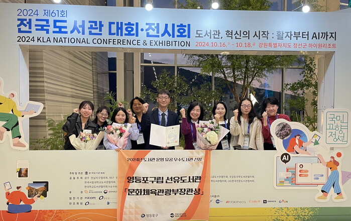 | ▲ 2024 제61회 전국도서관 대회에서 문화체육관광부 장관상을 수상한 영등포구 선유도서관 관계자들이 기념촬영을 하고 있다. (사진=영등포구청 제공) |