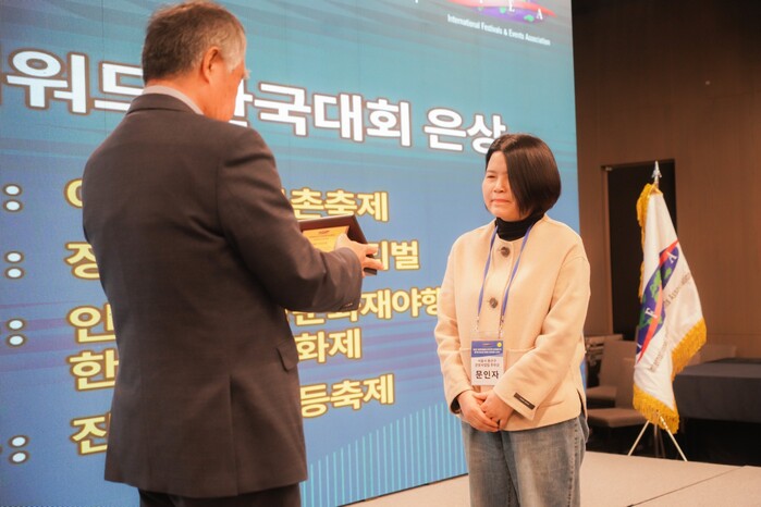 | ▲ 최근 열린 제17회 피너클 어워드 한국대회에서 '이태원 지구촌 축제' 담당 관광체육과 문인자 주무관이 대표로 수상하고 있다. (사진=용산구청 제공) |