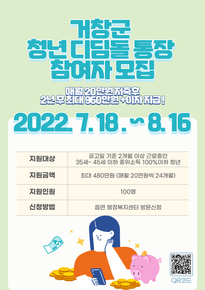 디딤돌 통장사업은 2022년 신규 사업으로 디디고 올라가는 돌이라는 ‘디딤돌’의 의미처럼 청년들의 삶의 질이 올라갈 수 있는 기반이 되길 희망하여 추진됐으며, 청년이 매월 20만원을 저축하면 본인 저축액과 거창군 자립 지원금(20만원)을 매칭 적립하여 2년 후 본인 저축액의 두 배와 이자를 지원받을 수 있는 정책이다.