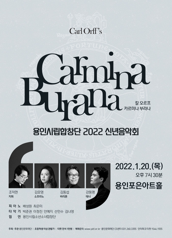 이번 연주회는 2022년의 포문을 여는 용인시립합창단의 신년음악회로 현대 독일의 대표적인 무대 음악 작곡가 칼 오르프의 가장 유명한 작품인 ‘카르미나 부라나’가 연주된다.