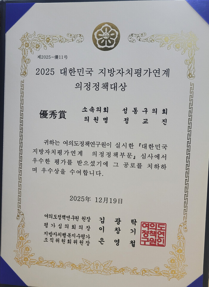 | ▲ '2025 지방자치 평가 의정정책 대상' 우수상. (사진=성동구의회 정교진 의원 개인 제공) |