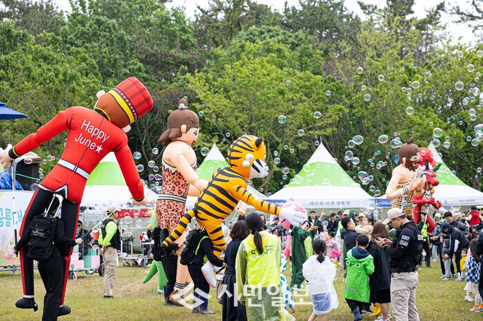 | ▲ 가족단위 관광객 등이 해남우황리 공룡박물관 일원에서 열린 공룡대축제 장 버블쇼 등을 즐기고 있다. / 자료사진 = 해남군 제공 |