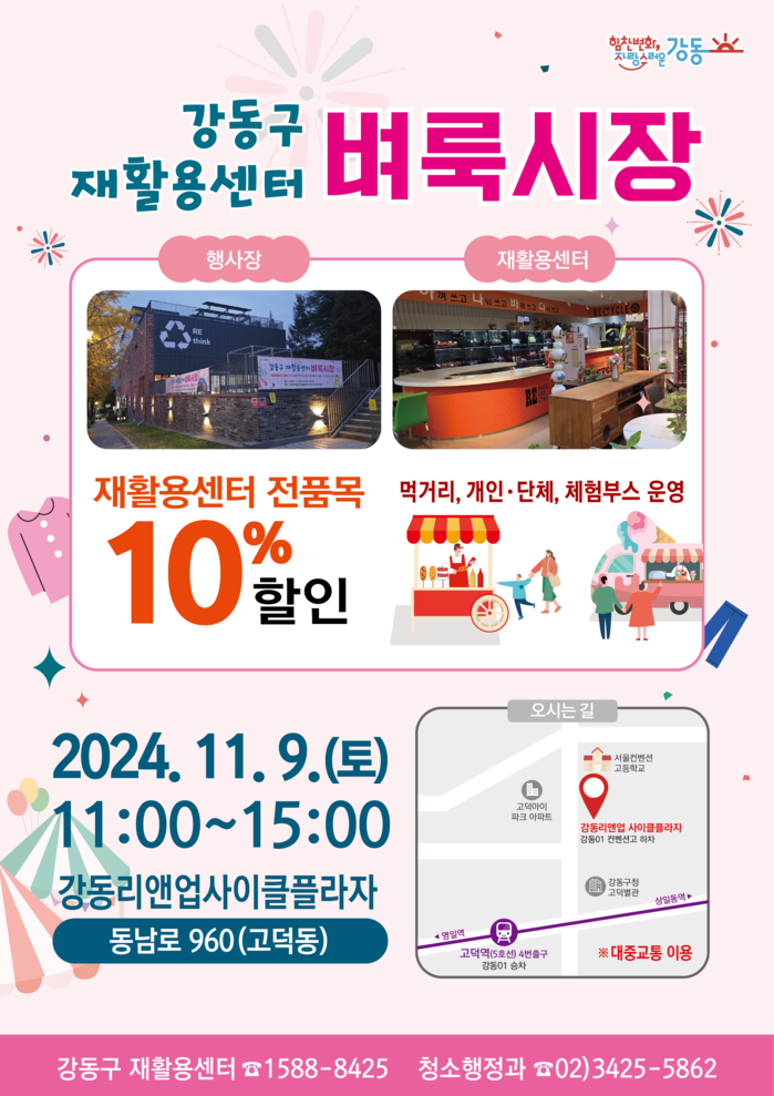 배경숙 청소행정과장은 “재활용센터 벼룩시장은 친환경 문화를 확산하고 분리배출을 실천하는 행사로, 방문하시는 분들을 위한 볼거리, 즐길 거리를 다채롭게 준비했다”라며, “이번 행사를 통해 강동리앤업사이클플라자와 재활용센터를 더 많이 알아가시는 기회가 되기를 바란다”라고 말했다.