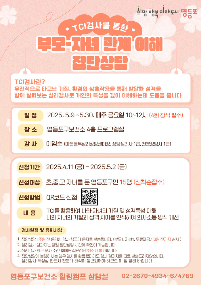 [시민일보 = 여영준 기자] 서울 영등포구(구청장 최호권)가 부모와 자녀 간 건강한 관계 형성을 돕기 위해 오는 5월9~30일 ‘TCI 검사를 활용한 부모 집단상담’ 프로그램을 운영한다고 밝혔다.
