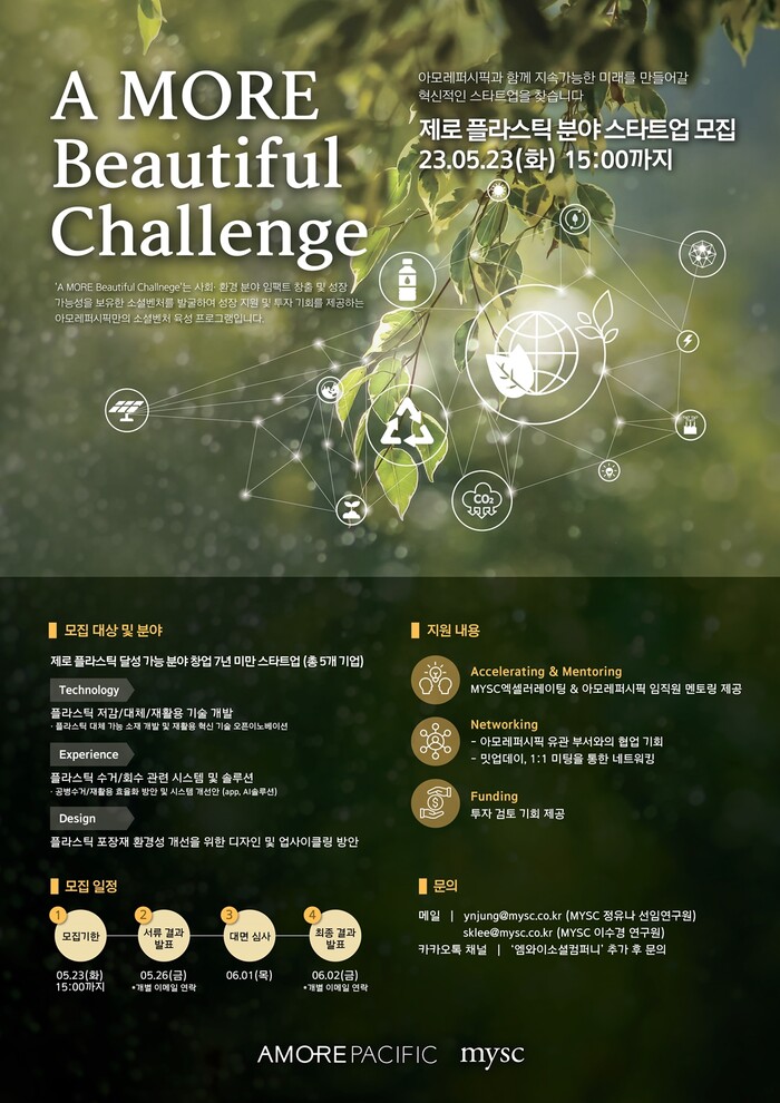 아모레퍼시픽이 주관하고 임팩트 투자사 엠와이소셜컴퍼니(MYSC)가 운영하는 ‘A MORE Beautiful Challenge’는 환경·사회 분야 스타트업을 발굴하여 아모레퍼시픽과의 협업 및 투자를 연계하는 프로그램으로 올해 2년 차를 맞이했다.