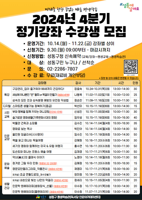 | ▲ 평생학습관 4분기 정기강좌 모집 포스터. (사진=성동구청 제공) |