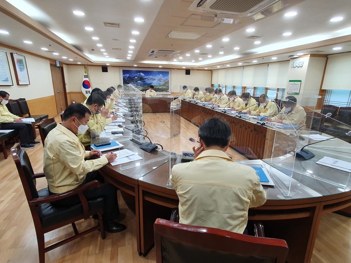 전남도교육청이 21일 장석웅 교육감 주재로 긴급 확대간부회의와 시·군 교육장 영상회의를 잇달아 열고 최근 전남도내 시 지역을 중심으로 확산하고 있는 학생과 교직원 감염 대응방안에 대해 논의했다. 사진은 장 교육감이 긴급확대간부회의를 주재하고 있는 모습. (사진제공=전남도교육청)