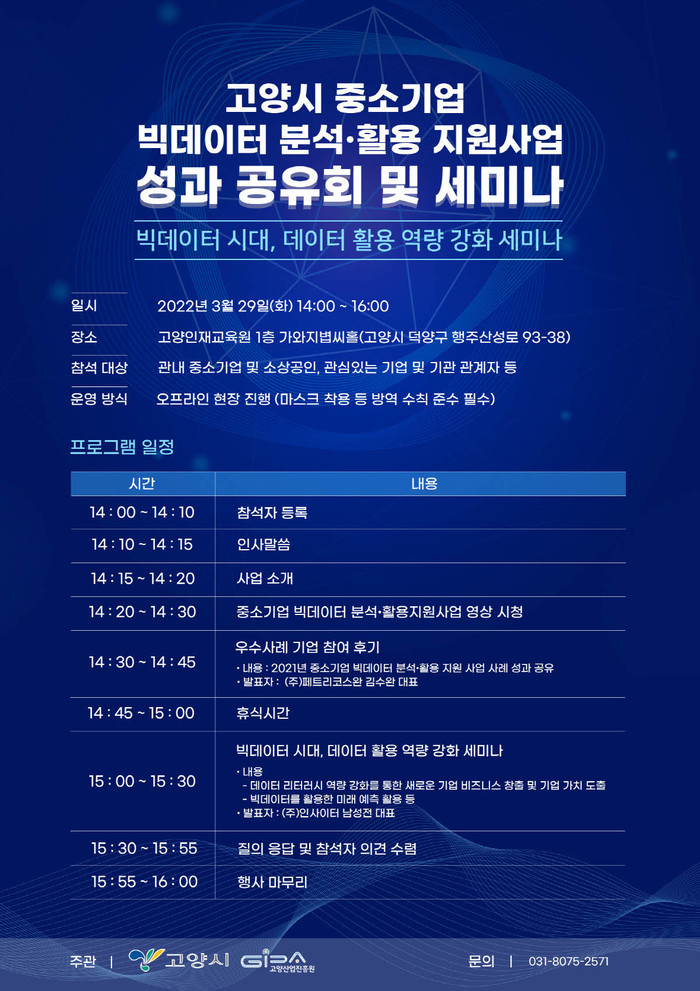 이번 행사는 고양시와 진흥원이 추진한‘2021년 고양시 중소기업 빅데이터 분석·활용 지원사업’의 우수 성과 사례를 공유하고 빅데이터 주제 세미나를 개최하여 관내 중소기업의 데이터 활용 역량 강화를 목적으로 개최된다.