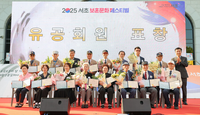 | ▲ 2025 서초 보훈문화 페스티벌에서 전성수 구청장(뒷줄 오른쪽 첫 번째)이 보훈단체 유공회원들과 표창수여식 이후 기념촬영을 하고 있다. (사진=서초구청 제공) |
