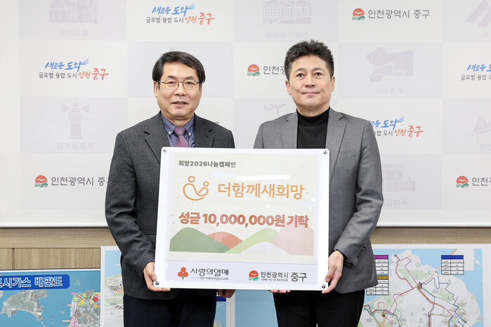 한편, 성금 기탁식은 지난 15일 오후 중구 제2청 구청장실에서 김정헌 인천 중구청장, 더함께새희망 김정해 회장 등이 참석한 가운데 진행됐다.