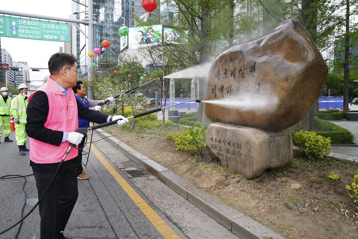 | ▲ 대청소 참석자들이 거리에 설치된 돌 조형물을 물로 세척 하고 있다. (사진=종로구청 제공) |