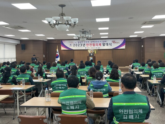도와 김해시는 지난 10일 오후 김해상공회의소 대회의실에서 최진회 경남도 안전정책과장, 김석기 김해부시장을 비롯한 관계 공무원과 참여 읍면동(북부동ㆍ장유1동) 민간단체 회원 90여명이 참석한 가운데 안전협의체 발대식을 개최했으며, 협의체 전문교육, 뱃지 수여, 안전슬로건 외치기 순으로 진행됐다.