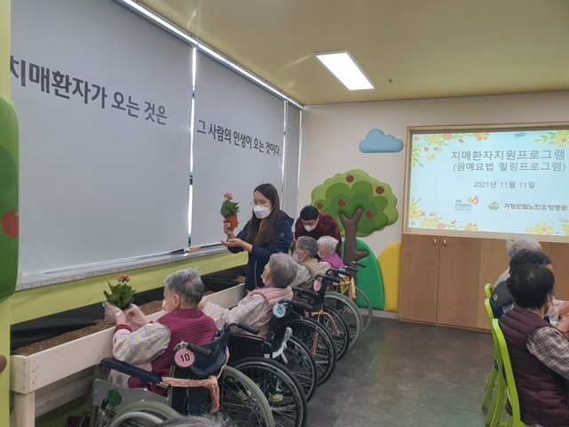 거창군립노인요양병원(대표 배영봉) 사회사업팀은 어르신들이 병원에 입원기간 동안 지나다니며 볼 수 있도록 병원에 실내 화단을 조성했으며, 치매안심센터는 그 공간에 식물(카랑코에)을 어르신들이 직접 심도록 원예 활동을 돕고 인지 강화 교육을 진행했다.