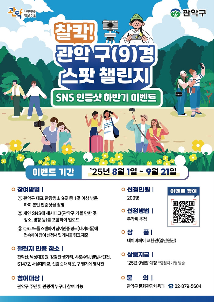[시민일보 = 문민호 기자] 관악구(구청장 박준희)는 지역 대표 관광명소를 널리 알리고 주민과 방문객에게 특별한 즐거움을 제공하기 위해 상반기에 이어 하반기에도 ‘찰칵! 관악 구(9)경 스팟 챌린지’ SNS 인증샷 하반기 이벤트를 개최한다고 28일 밝혔다.