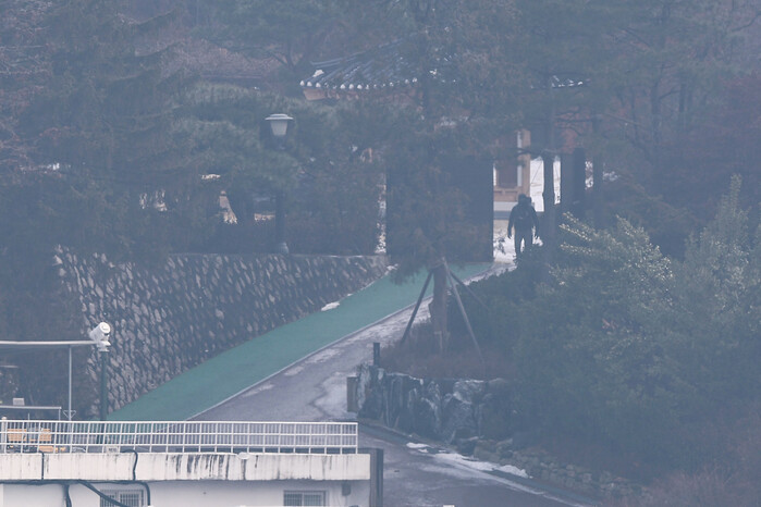 | ▲ 윤석열 대통령에 대한 체포영장 2차 집행이 임박했다는 전망이 나오는 가운데 14일 오전 서울 용산구 한남동 대통령 관저에서 경호처 소속으로 추정되는 직원이 경내를 순찰하고 있다.(사진=연합뉴스 제공) |