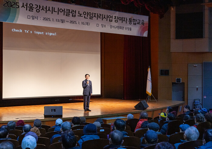 서울 강서구가 지난 13일 강서구민회관에서 ‘서울강서시니어클럽 노인일자리사업 참여자’ 500여명을 대상으로 교육을 실시했다. 사진은 진교훈 구청장이 교육에 참석해 인사말을 하는 모습. (사진=강서구청 제공)