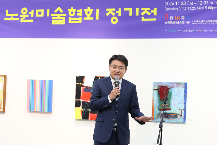 | ▲ 오승록 노원구청장이 25일 오후 서울 노원구 노원문화예술회관 아트뮤지엄에서 열린 2024 노원미술협회 제28회 정기전에 참석해 인사말을 하고 있다. (사진=노원구청 제공) |