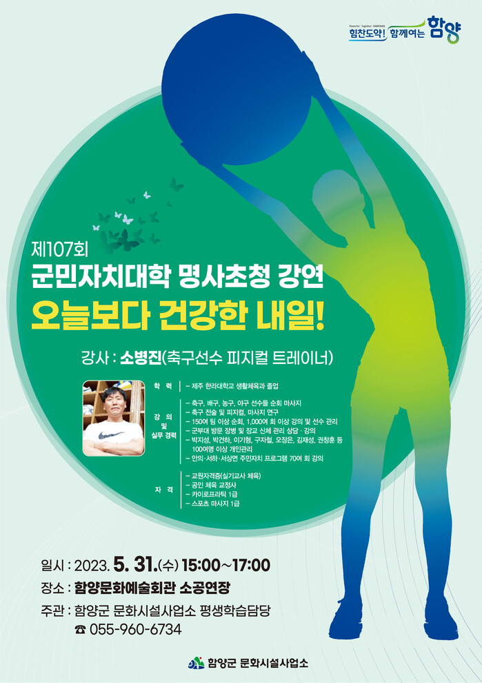 이번 군민자치대학 초청 강사는 축구선수 피지컬 트레이너로서 축구계의 약손이며 항상 곧고 푸르게 살고 싶어 ‘소나무’란 예명을 지었다는 ‘소나무 선생, 소병진’씨로 “오늘보다 건강한 내일”이라는 주제로 진행된다.