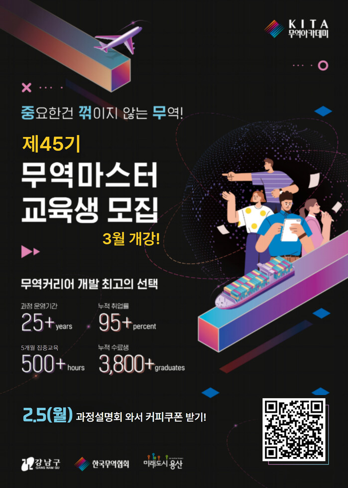 제45기 무역마스터 과정은 오는 3월25일부터 5개월간 총 400시간 동안 강남 코엑스 한국무역협회 무역아카데미에서 진행된다.