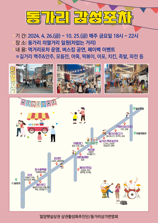 동가리 감성포차는 동가리상가번영회(회장 조덕현)와 밀양햇살상권 상권활성화추진단 공동 주관으로 올해 10월 말까지 운영되며, 길거리 생맥주, 먹거리와 색소폰·통기타 연주 등 다양한 공연과 음악을 함께 즐길 수 있다.
