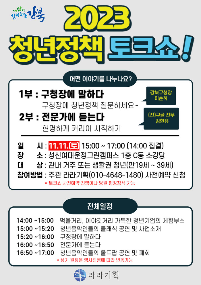 먼저 1부 행사는 포럼에 참여한 청년들과 이순희 강북구청장이 소통하는 토크 콘서트로, 청년정책 공모사업에 선정된 ㈜라라기획이 주관한다.