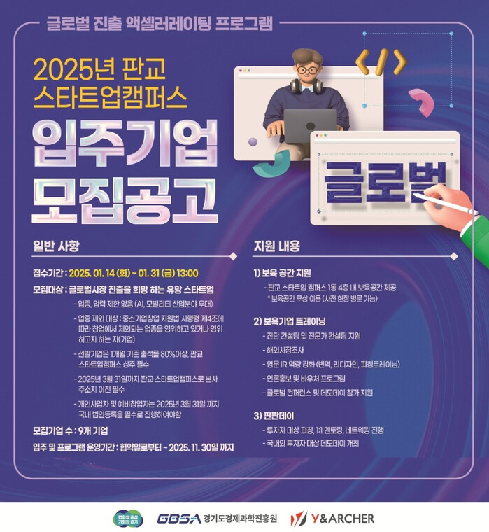 보다 자세한 사항은 K스타트업 홈페이지에서 ‘2025 판교 스타트업 캠퍼스’를 검색하면 확인 가능하며, 와이앤아처 글로벌전략그룹이나 판교 스타트업캠퍼스 글로벌전략센터에 전화문의로도 확인 가능하다.