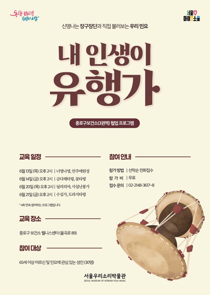 [시민일보 = 이대우 기자] 종로구(구청장 정문헌)가 오는 13~21일 목요일과 금요일마다 종로구 웰니스센터 웰니스홀(종로구 율곡로 89)에서 ‘우리소리 건강노래교실 -내 인생이 유행가’를 운영한다.