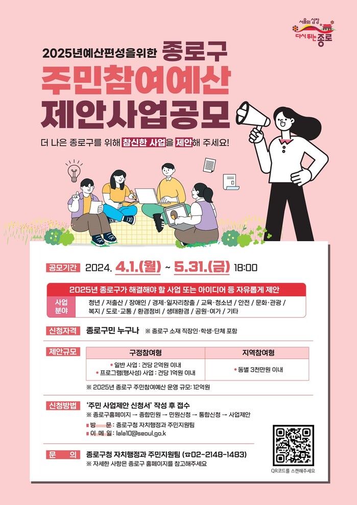 [시민일보 = 이대우 기자] 종로구(구청장 정문헌)가 오는 5월31일까지 내년도 예산 반영을 위한 ‘2024년도 주민참여예산 제안사업’ 공모를 진행한다.