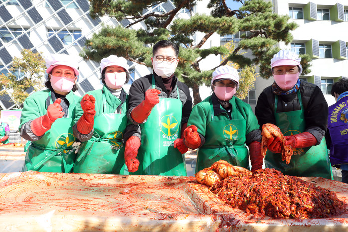 서울 강동구 새마을부녀회는 최근 어려운 이웃을 위해 ‘사랑의 김장나눔’ 행사를 개최했다. 이번 김장행사는 전년보다 80가구 이상 지원가구를 늘려 지역내 소외계층 309가구(가구당 10kg)에 전달할 계획이다. 사진은 이날 이정훈 구청장(가운데)이 봉사자들과 기념촬영을 하고 있는 모습. (사진제공=강동구청)