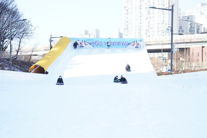 | ▲ 지난해 12. 22.~ 2. 4. 석관동 우이천 다목적광장과 길음뉴타운 7단지 앞 공터 두 곳에서 운영한 ‘성북 겨울 테마파크’가 구민들에게 겨울철 최고의 추억을 선물했다. 눈썰매를 즐기는 모습 (사진=성북구청 제공) |