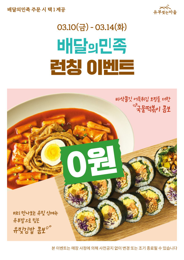 10일부터 14일까지 진행되는 이번 이벤트는 고객이 배달의민족 앱을 통해 유부빚는마을 메뉴를 배달·포장 주문하고 리뷰 작성을 약속하면 ‘어묵튀김 국물떡볶이 콤보’ 또는 ‘유빚김밥 콤보’를 무료로 제공하는 이벤트로 제공 상품, 마케팅&홍보 등 이벤트 진행에 필요한 인적, 물적 자원을 가맹본부인 ㈜올투딜리셔스가 전 가맹점에 무상으로 지원한다.