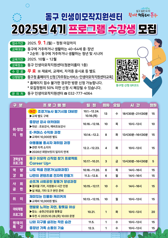 [인천=문찬식 기자] 인천 동구 인생이모작지원센터는 중ㆍ장년의 새로운 도전과 재취업을 지원하기 위해 오는 9월1일부터 ‘2025년 4기 동구 인생이모작지원센터 프로그램’ 수강생을 모집한다고 26일 밝혔다.