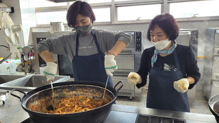 | ▲ 도봉구 벗꽃봉사단이 드림스타트 아동 가정에 배달할 밑반찬을 조리하고 있다. (사진제공=도봉구청) |
