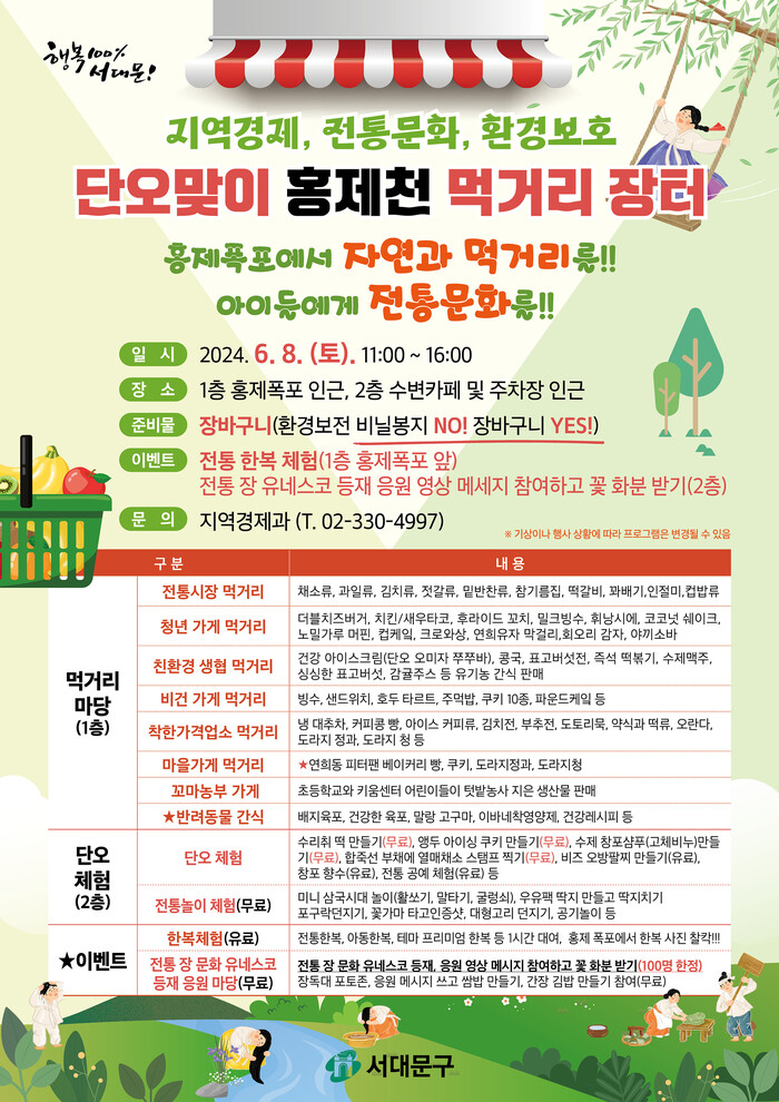 [시민일보 = 변은선 기자] 서대문구(구청장 이성헌)가 오는 8일 오전 11시~오후 4시 서대문 홍제폭포 광장 일대에서 ‘단오맞이 홍제천 먹거리 장터’를 개최한다.