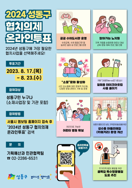 [시민일보 = 홍덕표 기자] 서울 성동구(구청장 정원오)는 오는 23일까지 2024년 성동구 협치의제 선정을 위해 온라인 주민투표를 실시한다.