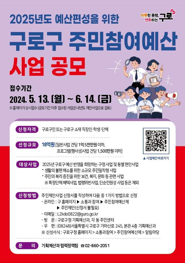 [시민일보 = 이대우 기자] 구로구(구청장 문헌일)가 5월13일부터 6월14일까지 2025년도 주민참여예산 사업을 공모한다.