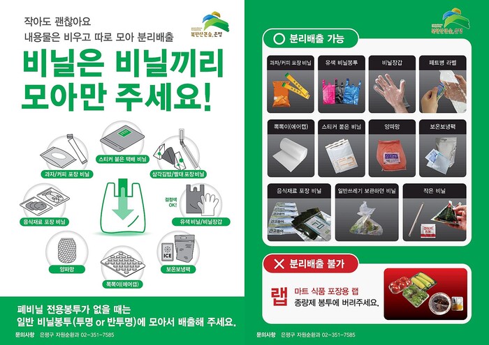 [시민일보 = 이대우 기자] 은평구(구청장 김미경)가 오는 8월부터 생활쓰레기 감축을 위한 ‘폐비닐 분리배출 활성화 사업’을 실시한다.
