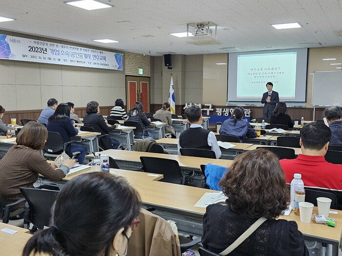 | ▲ 서울 성북구가 지역 개업(소속)공인중개사 대상 교육 등을 활용해 깡통전세, 전세사기 피해 방지와 안전한 부동산 거래를 위한 노력을 기울이고 있다. 사진은 23일 성북구 평생학습관에서 진행한 2023 개업(소속)공인중개사 연수 교육에서 한국공인중개사협회 류상규 전임교수의 전세사기 예방에 대한 강의를 듣고 있는 성북구 개업(소속)공인중개사. (사진=성북구청 제공) |