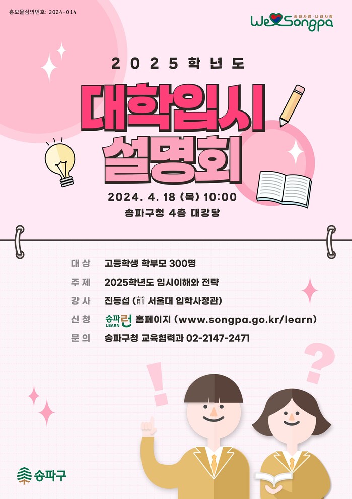 [시민일보 = 이대우 기자] 서울 송파구(구청장 서강석)가 오는 18일 10시에 송파구청 대강당에서 드라마 ‘SKY캐슬’의 실존 입시코디로 유명한 진동섭 강사와 함께하는 ‘2025학년도 대학 입시 설명회’를 개최한다고 밝혔다.