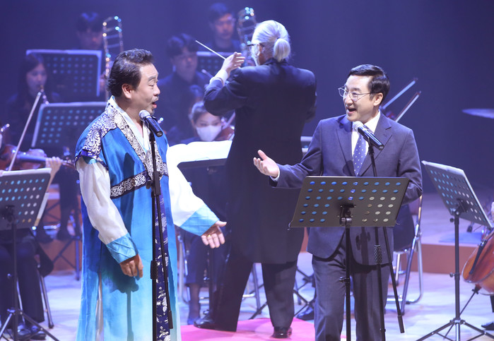 이동진 서울 도봉구청장이 지난 6일 도봉구민회관 재개관을 기념해 열린 '만추의 서정, 간송음악회'에 참석해 구민들과 공연을 관람하고, 공연자들과 함께 기념 축하 공연을 선보였다. 간송음악회는 도봉의 대표 역사인물이자, 문화재 수호자 간송 전형필 선생의 뜻을 기리고자 매년 봄과 가을 간송옛집에서 개최해온 행사이다. 사진은 이 구청장(오른쪽)이 공연을 선보이는 모습. (사진제공=도봉구청)